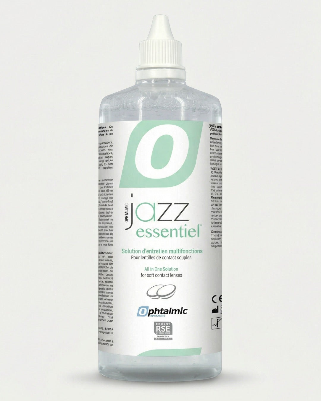 Ophtalmic Jazz Essentiel 400 ml désinfecte, hydrate et lubrifie les lentilles de contact pour un confort dès la pose et tout au long de la journée grâce à la synergie :
